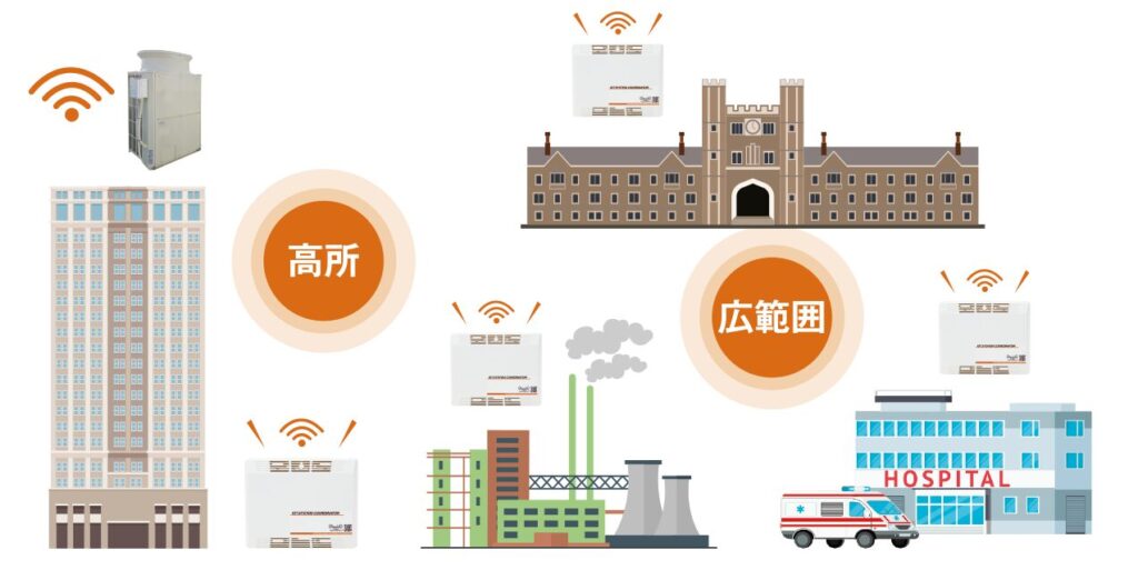 また、増設や移設を行う際も、付け替えるだけでよいため、費用を安価に抑えることができることも大きな特徴のひとつです。高所にあるビルの屋上や、建物が複数に分かれている広い敷地でも、安定した通信で利用でき、中継機を用いることで無線範囲を拡大することもできます。