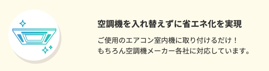 エナジーセーバーは、既設の空調機に後から取り付けるだけで導入が完了する手軽さが大きな魅力のひとつです。空調機メーカーを問わず対応しているため、大がかりな工事や設備をまるごと交換する必要がありません。