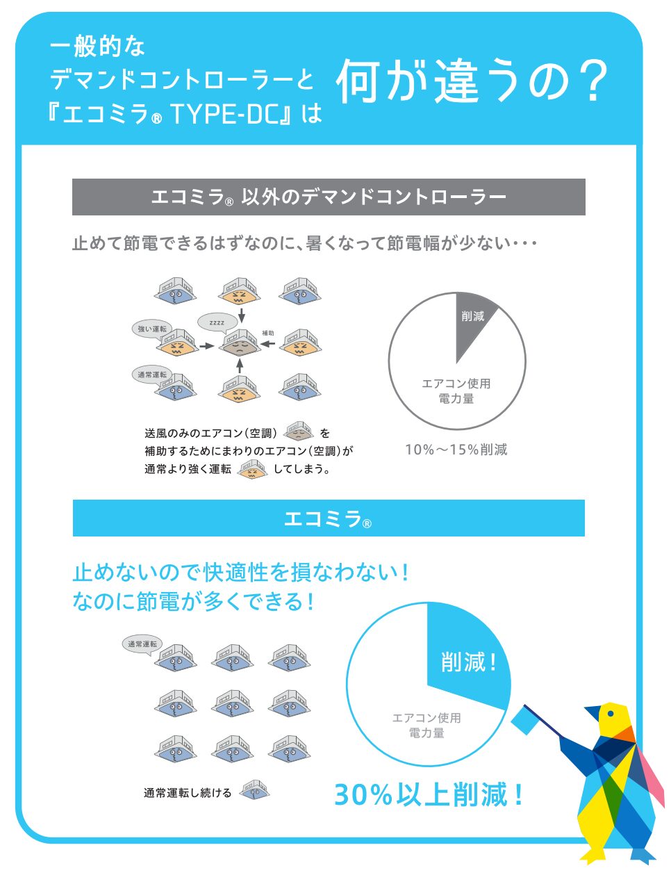 しかし、エコミラは、エアコンを止めない制御という世界で唯一の技術を特許として取得しています。他社のデマンドコントローラーの多くが、エアコンの運転を「送風」に切り替えてデマンドを抑制するのに対し、エコミラDCは、室外機のコンプレッサーの回転数を細かく制御することで、熱交換をつねに行い、エアコンの稼働を止めずに電力を削減します。この独自技術によって、施設内の快適な環境を維持しつつ、デマンド値の抑制と電気料金の削減が可能になります。