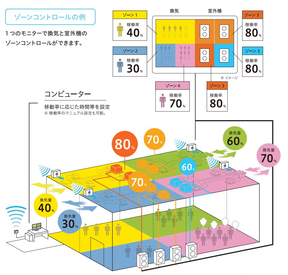 エコミラは、既存の空調設備に後付けで設置するため、新たに設備を入れ替える必要がありません。また、エコミラDCとエコミラAIRについては本体1台で室外機80台まで一括接続ができ、8つのゾーンに分けて設定ができるため、費用を抑えながらもゾーンごとに快適さを保つことができるのです。