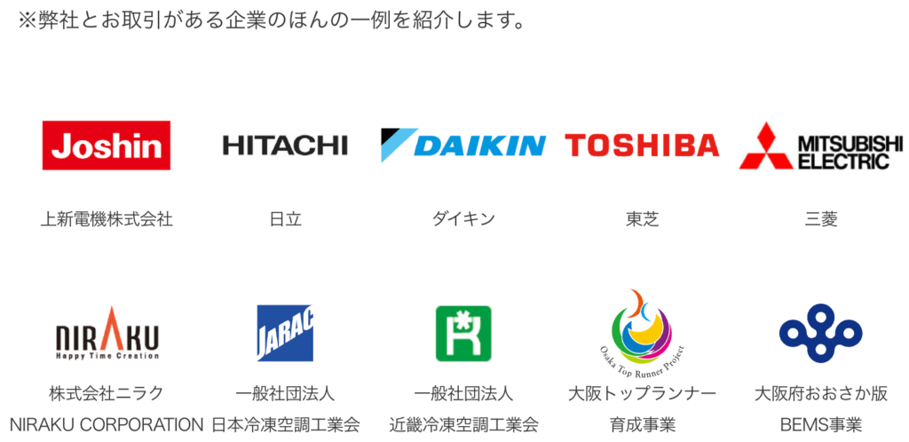 エコミラDCは、上新電機株式会社をはじめ、日立、ダイキン、東芝、三菱、関西電力といったさまざまな大手企業に導入されています。これらの豊富な導入実績は、製品の信頼性を証明するひとつの証と言えます。