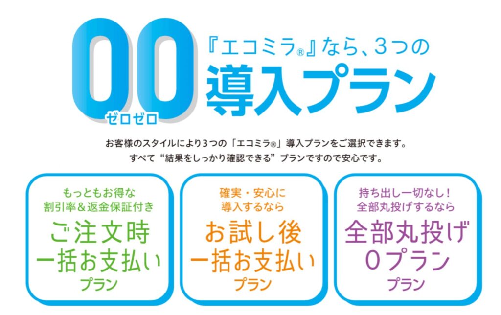 エコミラには、企業のニーズに合わせて選べる3つの導入プランが用意されており、どのプランも、事前の試算と試験設置を行い、シミュレーション通りの削減効果が得られるかを確認できるため、安心して導入を決定できます。