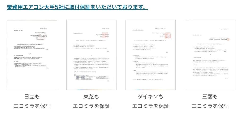 さらに、ダイキン、日立、三菱、東芝、Panasonicといった大手5社のエアコンメーカーの保証やメンテナンスを継続して利用できるため、導入後も安心して運用できます。万が一、室外機の交換が必要になった場合でも、「安心サポートパック」に加入していれば工事費が無料になるなど、充実したアフターフォローが提供されているため、初めての導入でも不安を感じることはありません。